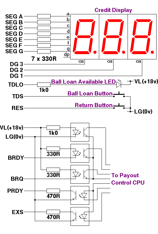 The SEG A-G and DG1-3 signals are connected to the 3 digit 7 segment common anode display. These display signals are completely isolated from the rest of the electronics in a pachinko machine. Current limiting resistors are present in the connections to this display and the display can be driven by strobing the DG1-3 signals with a +5v logic signal, and the SEG A-G signals are grounded to light the appropriate segments.