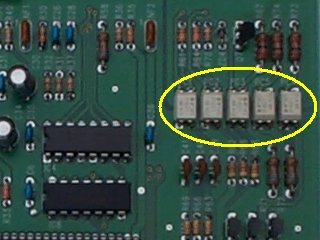 The opto-isolators look like small versions of the integrated circuit chips found elsewhere on the circuit boards, but only have two pins on each side. They can usually be easily distinguished from other devices as they tend to be yellow or white (whereas the normal integrated circuit chips are mostly black). On some machines the opto-isolators for the card reader signalling are combined into a single 16 pin package, and the opto-isolator for detecting the presence of the card reader unit is the only one using the four pin package. Also note that some or all of the opto-isolators may be on a seperate card reader interface board (along with the D-25 connector), rather than on the payout control board itself.