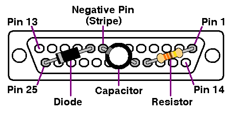 The capacitor is usually a 47uF 50v electrolytic capacitor (though these values can be higher without any problems), and is connected with the positive wire connected to pin 18 of the D-25 connector and the negative wire (denoted by the stripe on the package) connected to pin 8.
